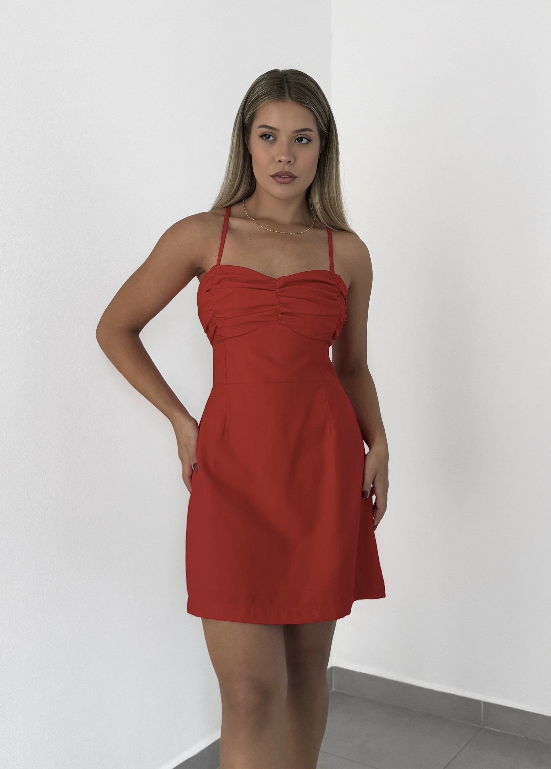 com busto plissado, ajuste de amarração nas costas e lastex, podendo vestir mais de um tamanho