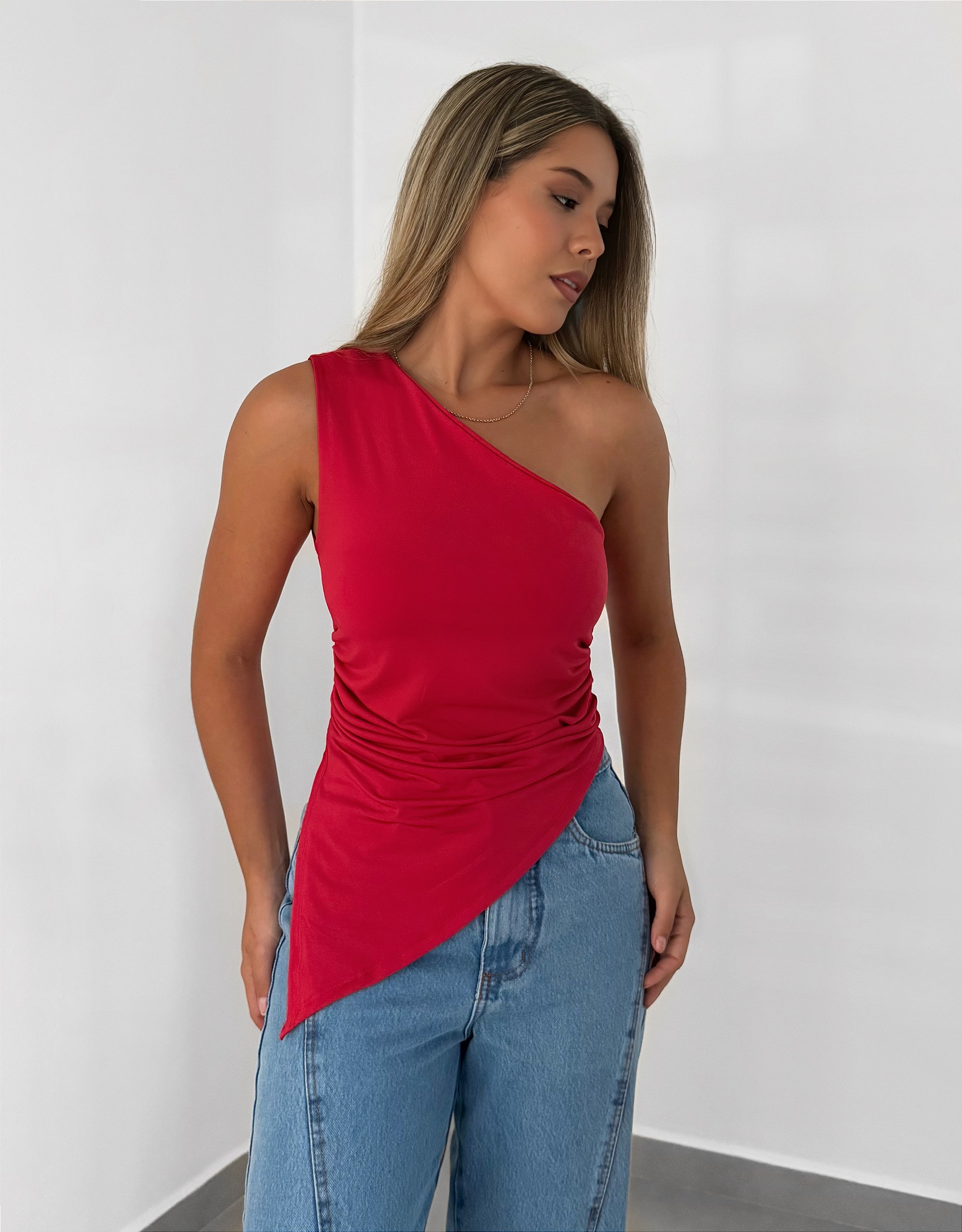 Regata em ombro único assimétrica, com lastex na lateral da cintura ficando plissado