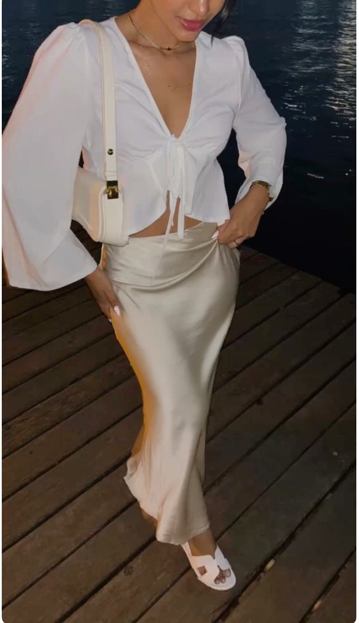 Saia midi de cetim, com zíper e elástico na cintura. TAM PP/P/34/36