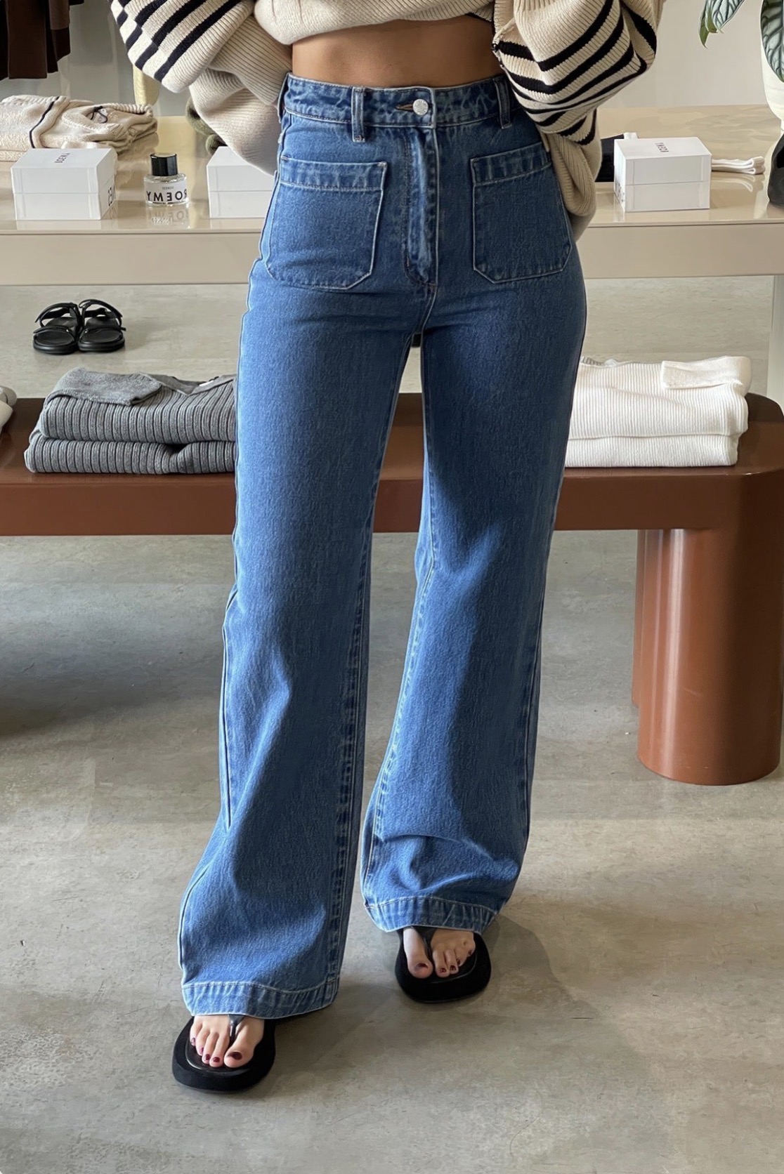 Calça wide leg jeans de elastano com bolsinho. Modelagem perfeita para o seu conforto e estilo