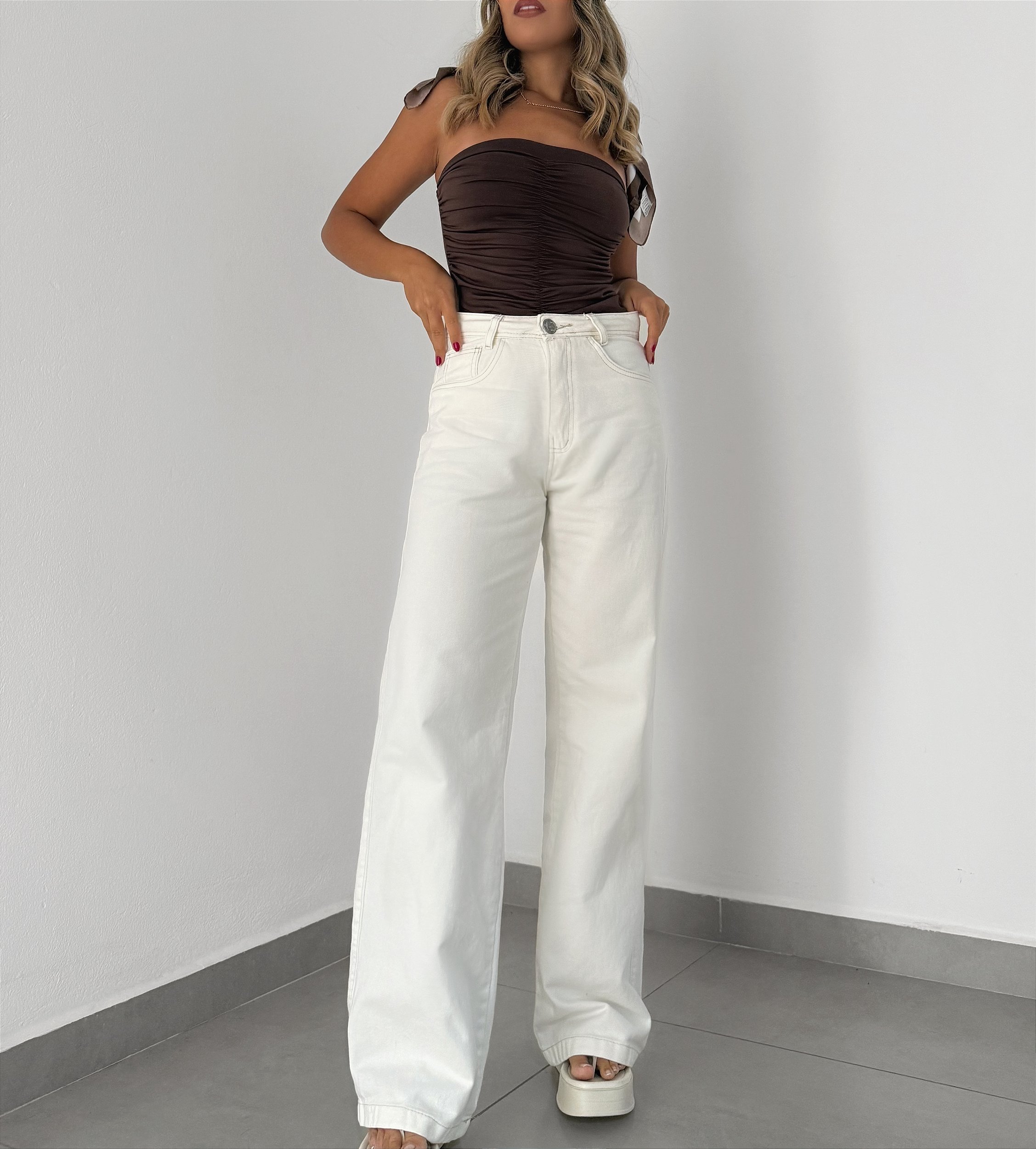 Wide leg jeans off white com tecido amaciado super gostosa.